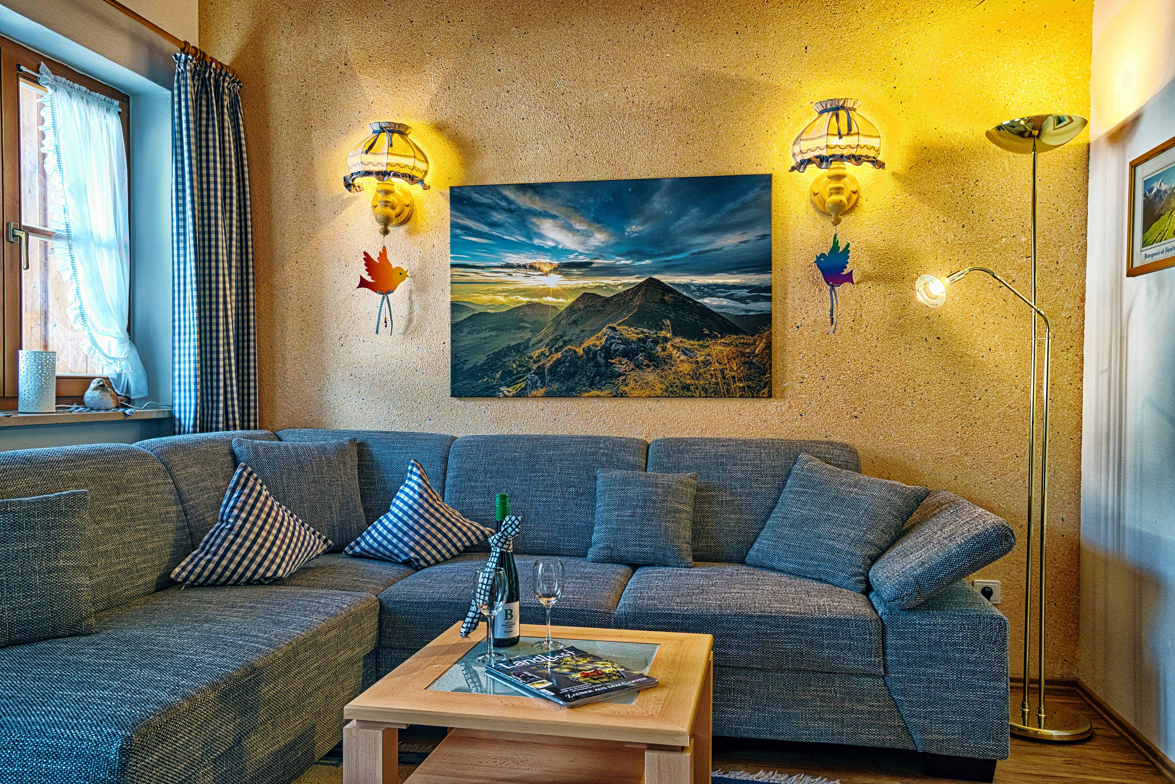 | Die Ferienwohnung Wetterstein ist eine neu gestaltete Wohnung mit sichtbarem Dachstuhl. Auf Teppichboden haben wir verzichtet, die Auslegware ist wischbar. Eine gemütliche Couch mit zwei Sesseln und einer Leselampe laden zum gemütlichen Entspannen ein. Ein neuer großer LCD-Full-HD-Fernseher lädt zum verweilen ein. Eine kleine Bücherei und diverse Spiele lassen auch bei schlechter Witterung keine Langeweile aufkommen. Für einen strahlenfreien Internetzugang haben wir Kabel verlegt und ein 5m Ethernet Kabel wird Ihnen zur Verfügung gestellt Auf einer großen Eckbank mit Tisch können Sie nach Herzenslust Ihre Speisen einnehmen. |